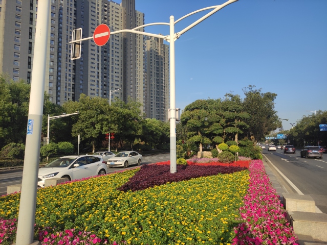 水韻路中分帶的花球也換上了新裝,10個巨大的牽?;ㄇ虮患t黃色的花帶簇擁著,在太陽下盡情地綻放著,像是小孩的笑臉,歡快地為祖國母親慶生。
