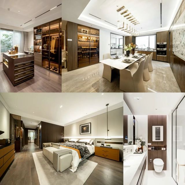 此次公開的樣板間為265㎡奢華四房?jī)蓮d三衛(wèi)雙陽(yáng)臺(tái)戶型,在戶型研發(fā)和飾面材料使用上,設(shè)計(jì)團(tuán)隊(duì)都針對(duì)主要客戶人群的需求,經(jīng)過(guò)反復(fù)斟酌,對(duì)細(xì)節(jié)處理更是精益求精,成為奧體公司迭新之作。硬朗的石材紋理與沉穩(wěn)的木飾面碰撞出豐富的層次變化,加上墻面局部銅制捶打紋飾面和內(nèi)嵌式金屬開關(guān)面板,營(yíng)造低調(diào)奢華的現(xiàn)代風(fēng)格。
