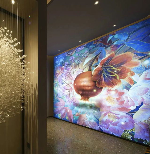 “人間歡喜事,石榴成熟時(shí)”,藝術(shù)生活館中一幅瑰麗絢爛的手繪花神圖渲染出主題氛圍,鮮花簇?fù)眍w粒飽滿石榴的畫幅,姹紫嫣紅中,將奧體公司開發(fā)的奧體新城各小區(qū)名稱中的植物元素有機(jī)組合在一起,觀眾置身其中,仿佛能聞到花的芳香、看到石榴籽的晶瑩剔透。畫面寓意著花開興隆、興旺昌盛,祝福幸福美好生活紅紅火火,也體現(xiàn)了河西集團(tuán)“開發(fā)幸福、運(yùn)營(yíng)美好”的經(jīng)營(yíng)理念。整幅花神圖由特邀手繪師親繪而成,十分珍貴。